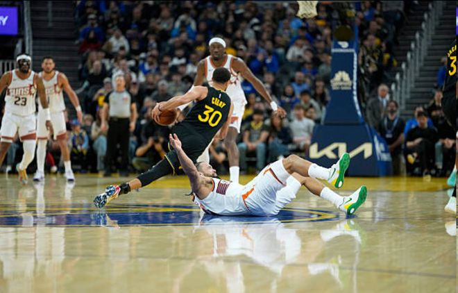 下半场,勇士加强了防守,在第三节,球队只让对手得到20分,勇士则是得到29分。虽然太阳在前三节落后6分,但是,他们仍然与勇士鏖战到最后一刻。不过,在最后1分40秒的时候,库里外线三分命中,勇士将比分拉开到7分。随后,太阳打出一波5-0小高潮,球队110-112落后勇士。
