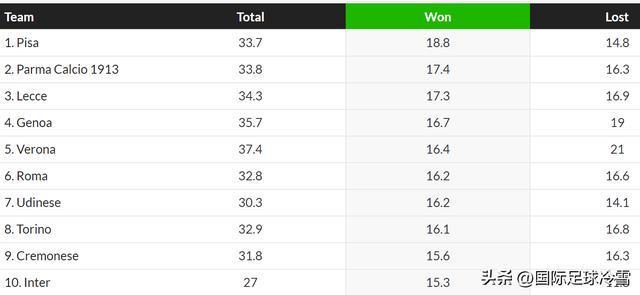 打541阵型的比萨,有8-9名身材高大的后卫,也是意甲头球争顶成功次数最多(221次),争顶成功率第二高(55.9%,仅低于国米的58.1%),解围次数最多的球队。
