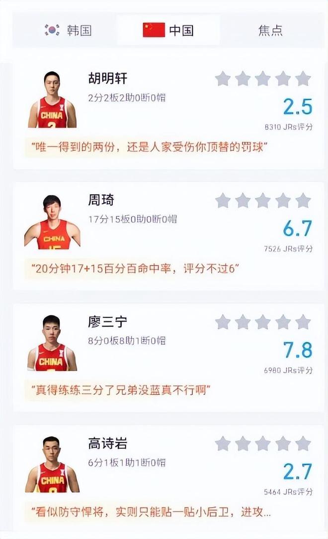 比赛结束后,有超过11.2万的球迷对球员的表现进行了评分,中国男篮球员的评分普遍都比较低,只有四名球员的评分还说得过去。这四名球员分别是程帅澎的8.4分、周琦的7分、廖三宁的7.7分,以及胡金秋的6.1分。至于其他球员和中国男篮主教练郭士强的评分,有些惨不忍睹。