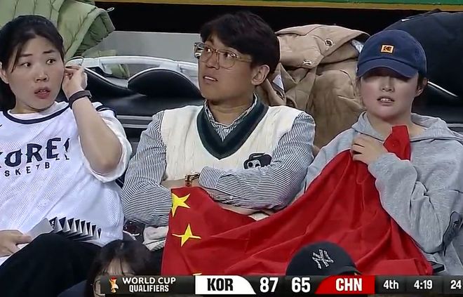 镜头给到看台的中国球迷,大家可以看到现场的中国球迷生无可恋、一脸的无奈、一脸绝望,时间进入最后1分半还落后18分,韩国队只需要消耗时间就能拿下胜利,实际上韩国队已经将他们板凳边缘的文正贤、金波贝等人换上,比赛走向完结。